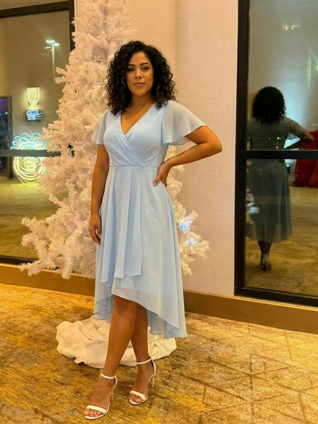 I wore this dress to my cousin’s wedding cocktail reception and it was exactly what I needed. The chiffon fabric is light and flowy, and the wrap-style V-neck is very flattering. It felt elegant without being overdone, and I was comfortable all evening.