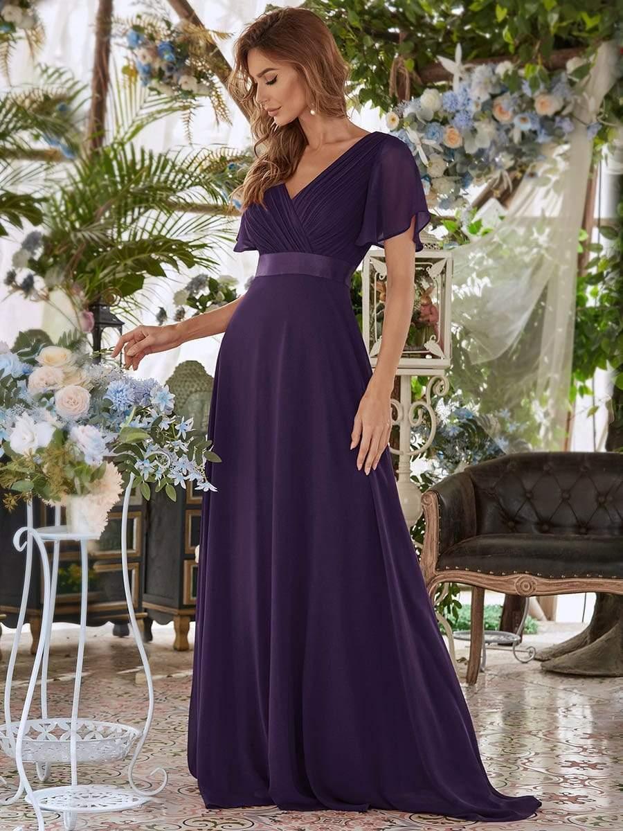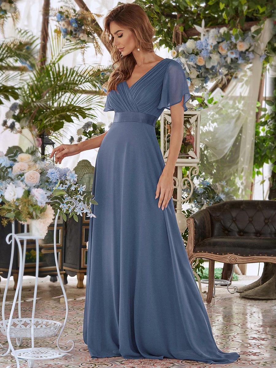 Step into elegance with this long chiffon empire waist bridesmaid dress. Featuring delicate short flutter sleeves and a flattering silhouette, this dress is perfect for weddings, formal events, and celebrations. Made from lightweight chiffon, it ensures comfort without compromising style. Whether you're a bridesmaid or a guest, this versatile dress promises timeless sophistication. Ready to shine? Order now and enjoy fast shipping for your next special occasion!