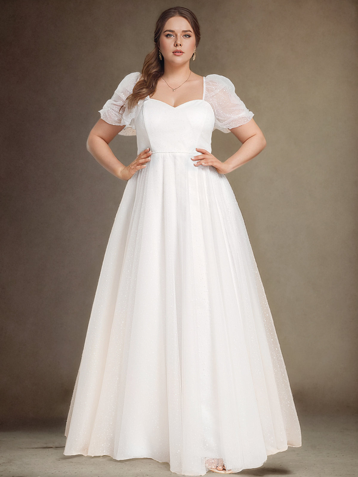 This A-line wedding dress exudes ethereal romance with its delicate tulle fabric and sweetheart neckline. The short sleeves add a touch of vintage charm, while the A-line silhouette flatters all figures with its flowing skirt. Perfect for the bride seeking a timeless yet romantic look on her special day, this dress is sure to enchant and captivate.
