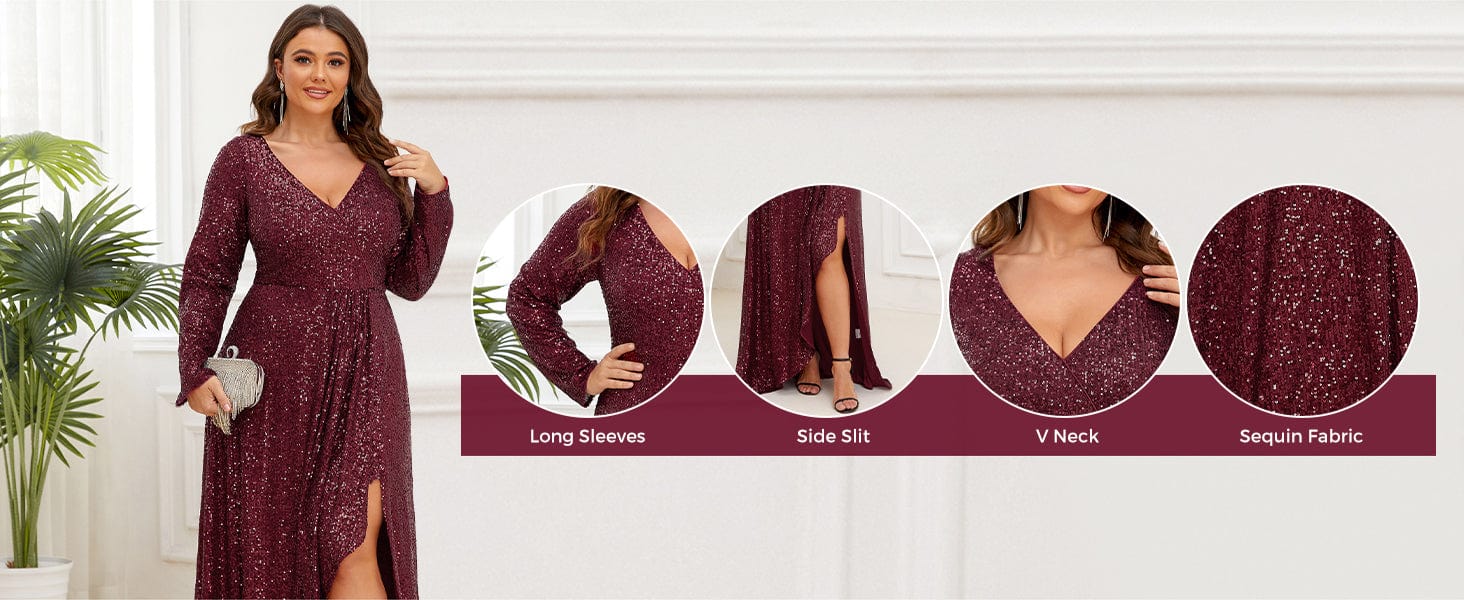 Plus Size Sequin V-Neck Long Sleeve High Slit Bodycon Evening Dress
