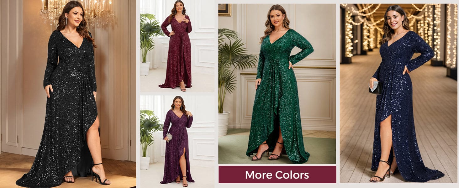 This glamorous floor-length evening dress features fitted long sleeves and a plunging cross-over v-neck collar with ruched detail. A cinched waist gives way to an asymmetrical ruffled hem with a high slit on the front, perfect for showing off your heels. Wear this decadent sequin semi formal evening gown to a wedding, the prom, a banquet, and so much more.