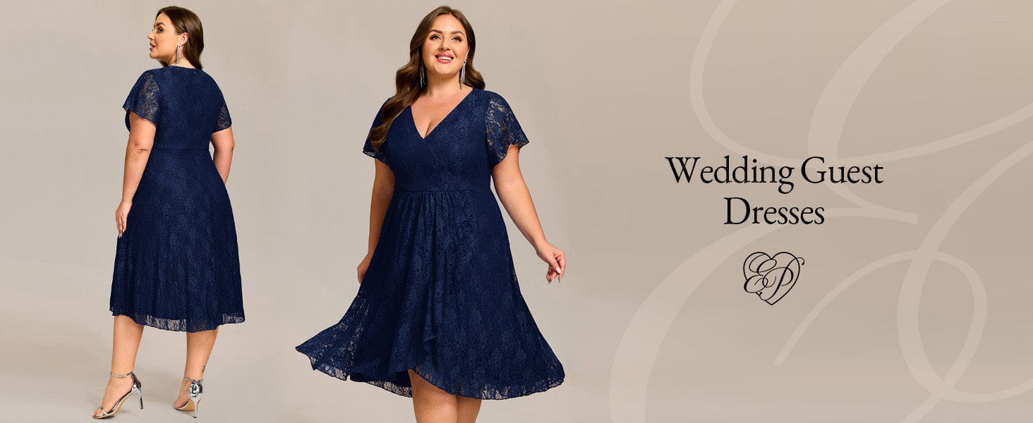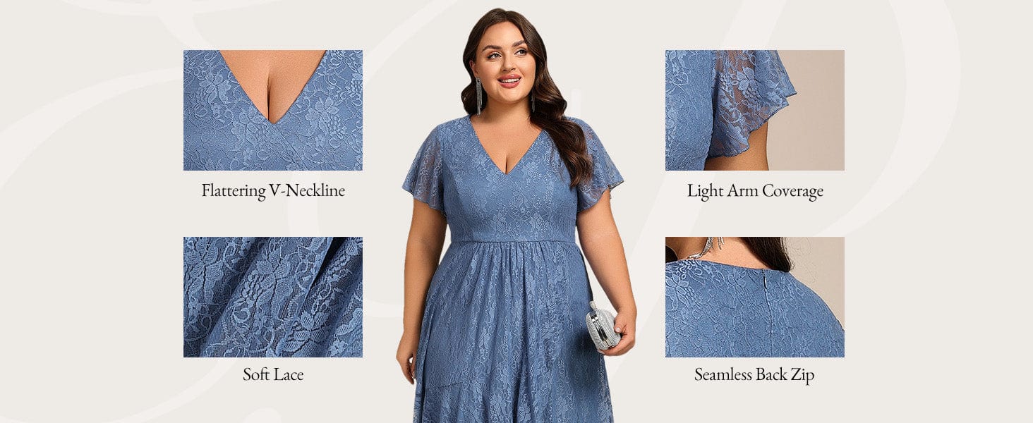 Plus Size Short Sleeves V-Neck A-Line Lace Midi Wedding Guest Dress