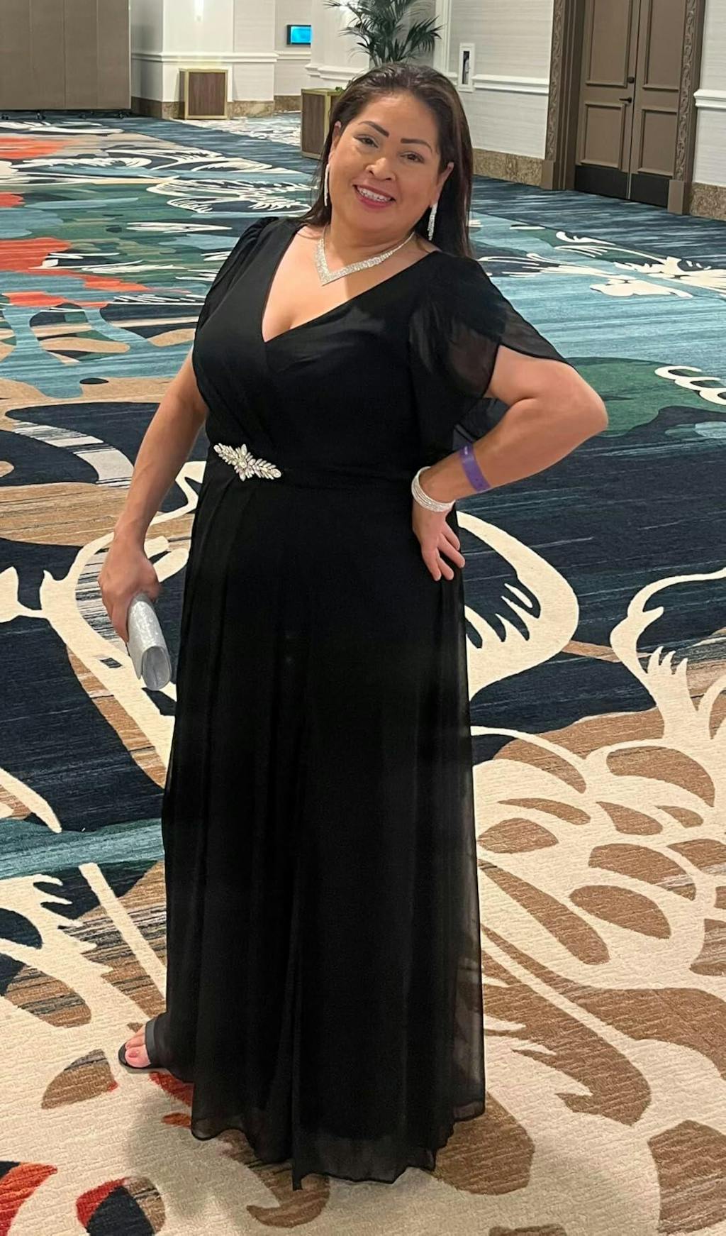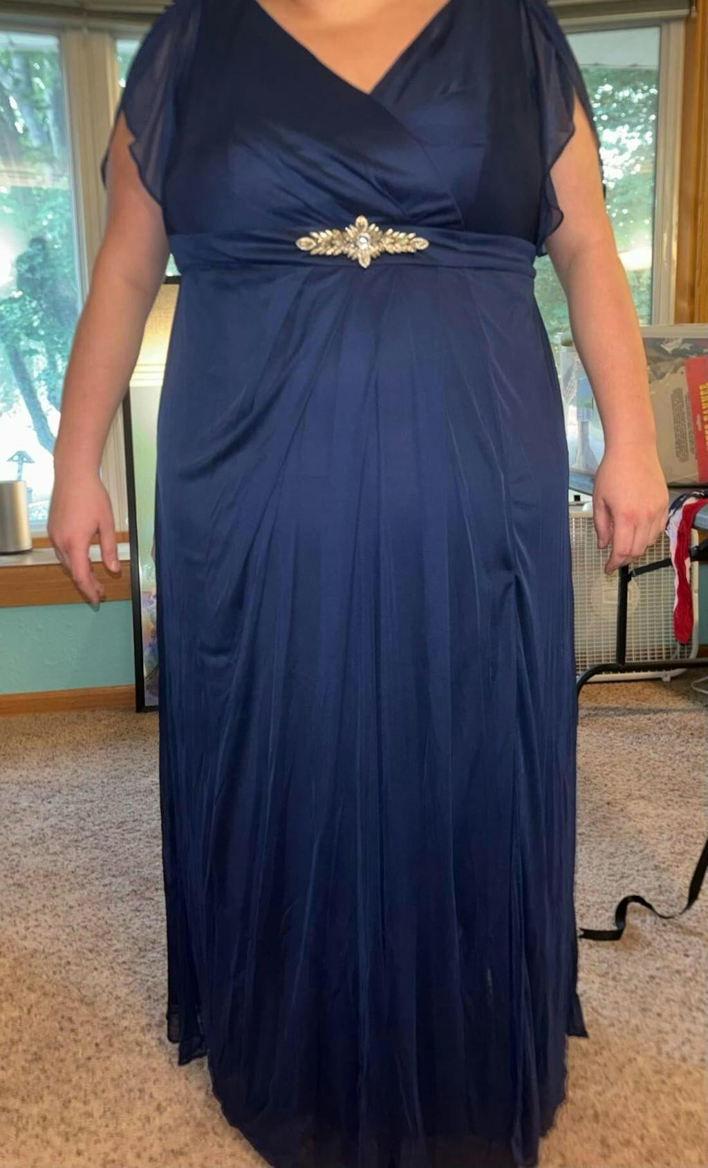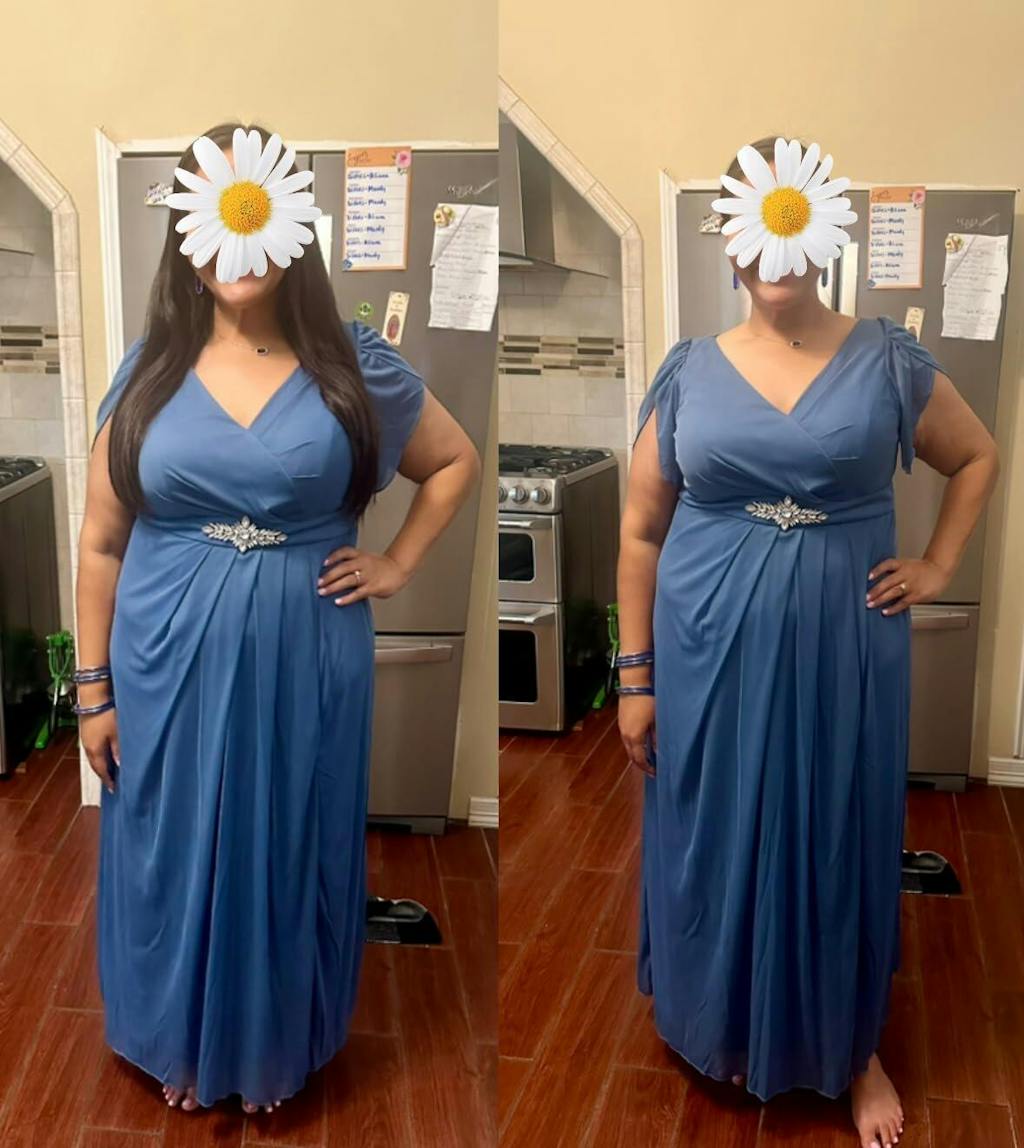This plus size formal gown features a flattering crossover bodice, short flutter sleeves, and a jeweled empire waist that subtly defines your shape while offering comfort and coverage. The flowing chiffon skirt with a front slit adds movement and elegance, making it the perfect choice for weddings, cocktail parties, black-tie events, or any special evening where you want to feel your most confident.