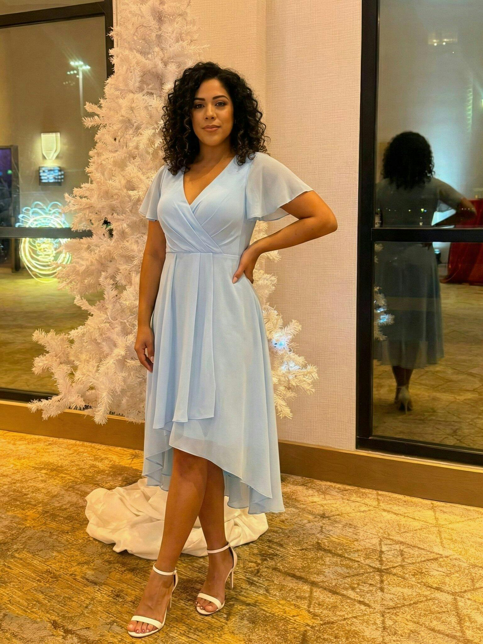 Elevate your style with our Ruffles Sleeve Pleated V-Neck A-Line Midi Chiffon Wedding Guest Dress. The delicate ruffled sleeves and pleated detailing add a touch of romance to this enchanting midi dress. The flattering A-line silhouette and V-neck create a timeless and sophisticated look. Crafted in chiffon, this dress is perfect for wedding guests who desire both elegance and comfort.