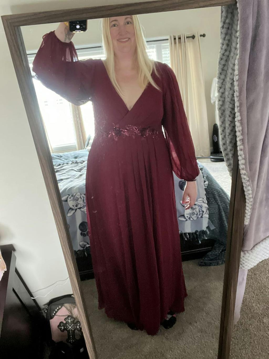 It is time to look like a princess by wearing this gorgeous plus size chiffon long lantern sleeves evening dress for curve. This plus lantern sleeves curvy formal dress features deep V-neck and long bishop sleeves. There is also applique designing near waistline which helps to accentuate the waist. This plus size maxi evening dress with lantern sleeves is solely made for plus size women so they can feel beautiful. We think this gorgeous plus long sleeve formal dress is perfect for all formal occasions, from evening party, cocktail, weddings to prom, homecoming, and graduation!