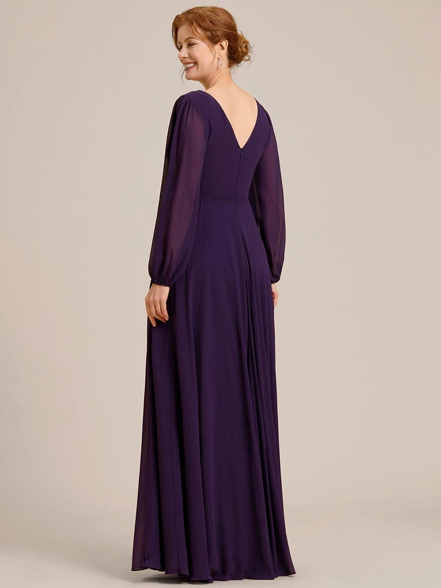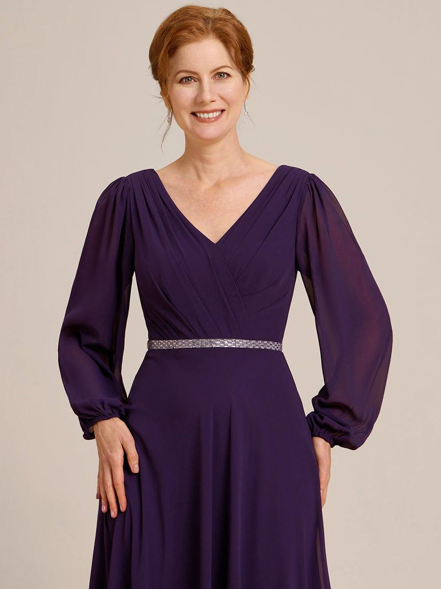 This elegant mother of the bride dress offers timeless sophistication. The pleated double V-neck and long sleeves create a flattering silhouette, while the shiny belt cinches the waist for a stunning hourglass shape. Crafted from chiffon, it drapes beautifully, offering both style and comfort for any formal occasion.